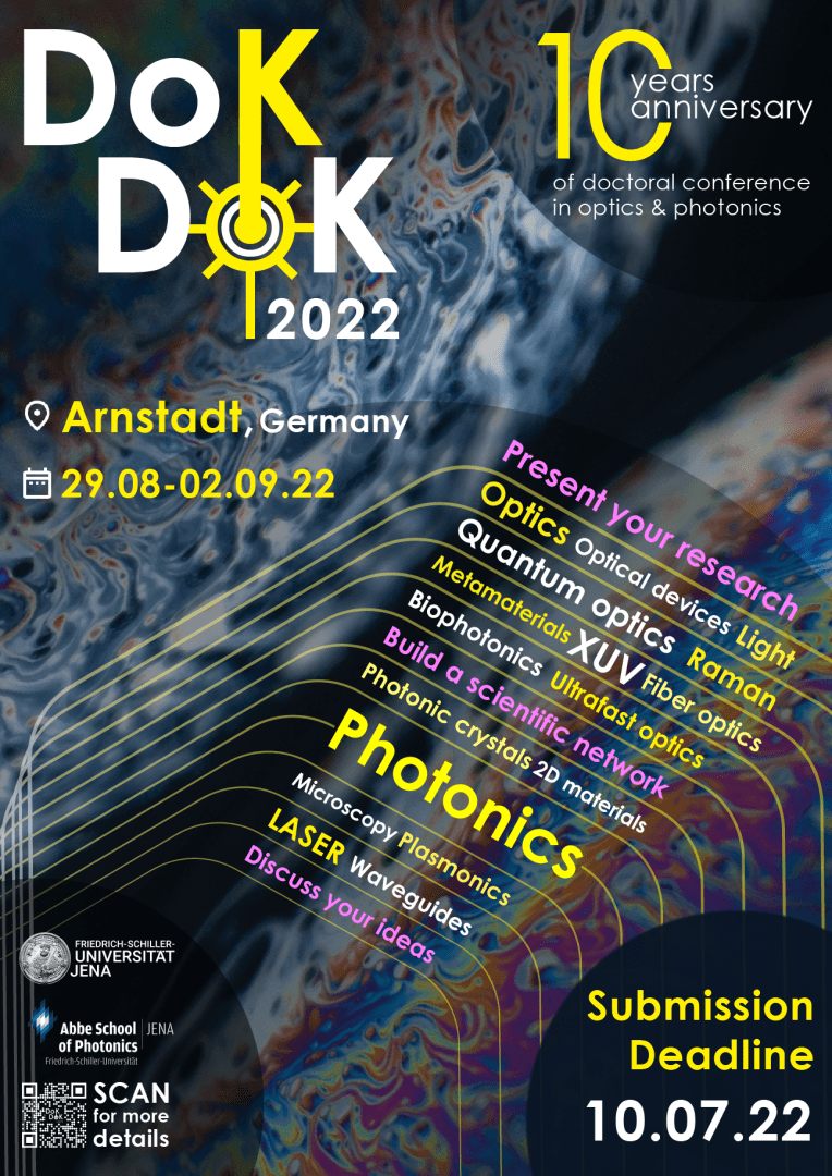 DoKDoK was back again for this year. First started in 2011, DoKDoK was an initiative of the Abbe School of Photonics. This year we celebrated DokDok's tenth anniversary. Over the last ten years, Jena’s traditional DoKDoK has successfully become an established international doctoral conference in Germany. DoKDoK offers top-notch scientific exchange, unique insights from renowned keynotes, industry exhibition booths, and a memorable social day.